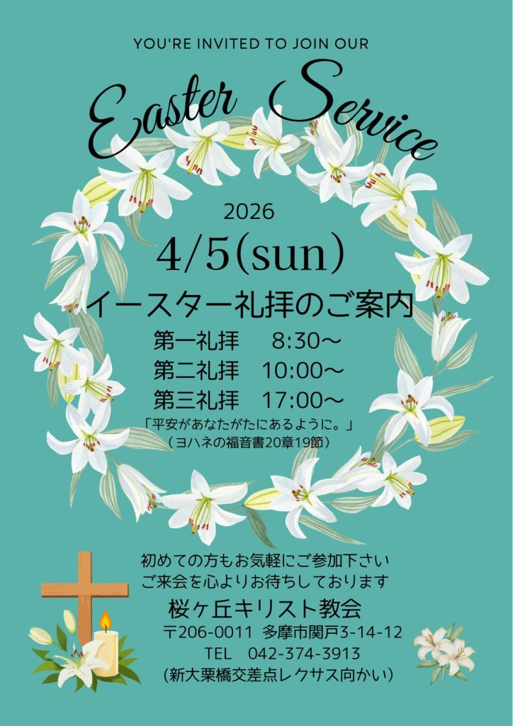 *今年のイースターは4月5日(日)です。多摩ニュータウン地域の協力教会合同の早朝礼拝があります。また当教会の第二礼拝では聖歌隊によるイースターの特別賛美があります。ぜひお越しください。