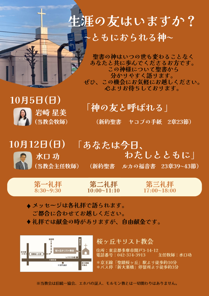 桜ヶ丘キリスト教会では年に2回、歓迎礼拝のときを持っています。10月5日と12日の2週に渡って、キリスト教や教会が初めてな方でもわかりやすいメッセージを用意しています。どなたでも礼拝への参加を歓迎いたします。第一礼拝〜第三礼拝まで1日3回同じ... -
