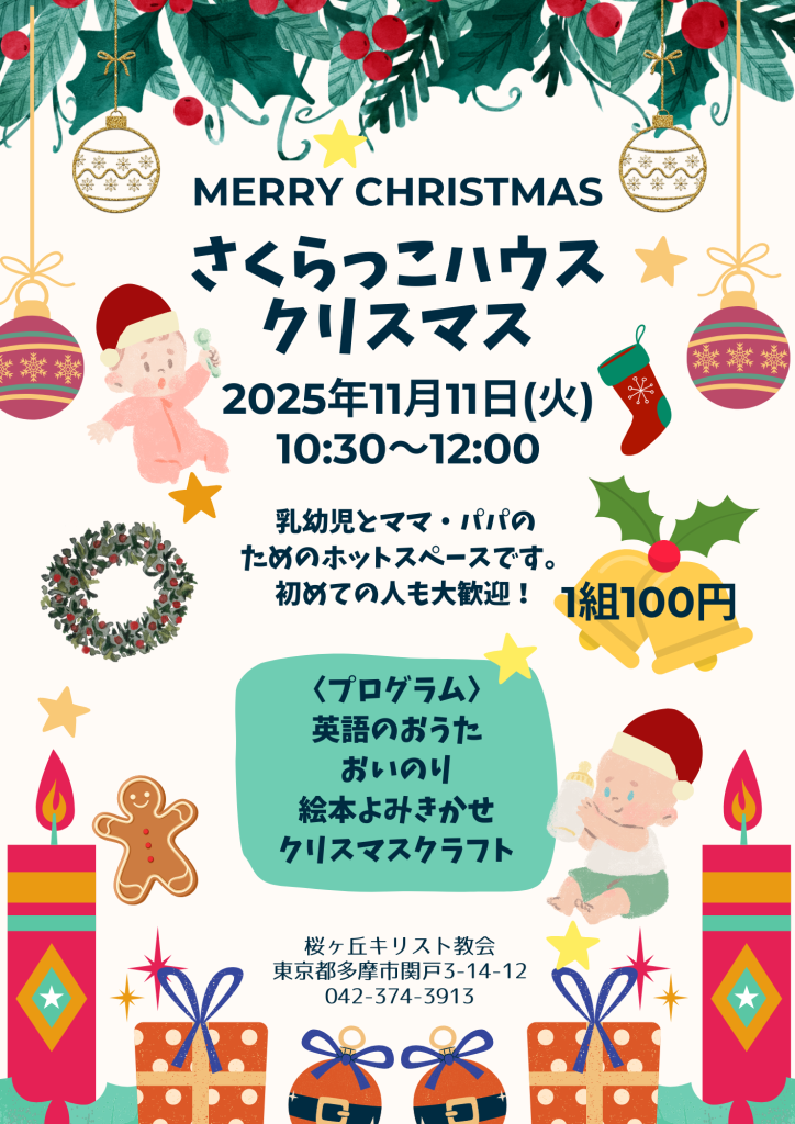日程 2025年11月11日(火)10:30〜12:00 会場 桜ヶ丘キリスト教会 別館1階 参加費 1組100円 さくらっこハウス乳幼児とママ・パパのためのホットスペースです。キリスト教の愛の精神に基づき、お子様やママ・パパとゆっくりした時間を過ごします。... -